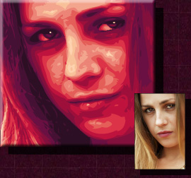 Your portrait painting is based upon your photograph. The first step is usually to crop the photo down to just the face. Then from this cropped photo, I create a small design sketch that defines the different areas of shapes and colors. This design is then drawn onto a stretched canvas of the desired size. Finally, the color palette - either an orange/red palette or a red/purple palette - is made up and, with these colors, the painting is then completed.